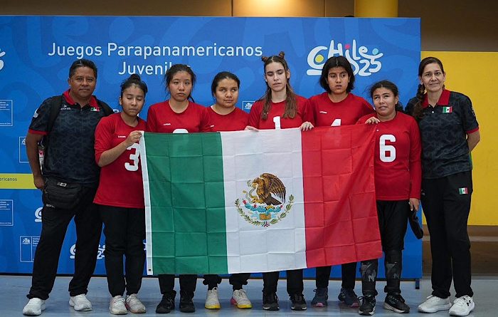 Santiago de Chile, Cl. 4 de noviembre de 2025.- Las atletas oaxaqueñas Belén Beteta Hernández, Elizabeth Yamile Rosales Pacheco y Yaretzi Santiago Morales; así como el entrenador oaxaqueño Miguel Ángel Sánchez Hernández, que integran la Selección Nacional Femenil de México, obtuvieron la medalla de bronce en los Juegos Parapanamericanos Juveniles Chile 2025 en golbol.