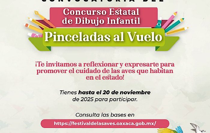 Tlalixtac de Cabrera, Oax. 8 de noviembre de 2025.– Con el objetivo de promover la reflexión y el cuidado de las aves que habitan en la entidad, la Secretaría de Medio Ambiente, Biodiversidad, Energías y Sostenibilidad invita al Concurso Estatal de Dibujo Infantil “Pinceladas al Vuelo”.