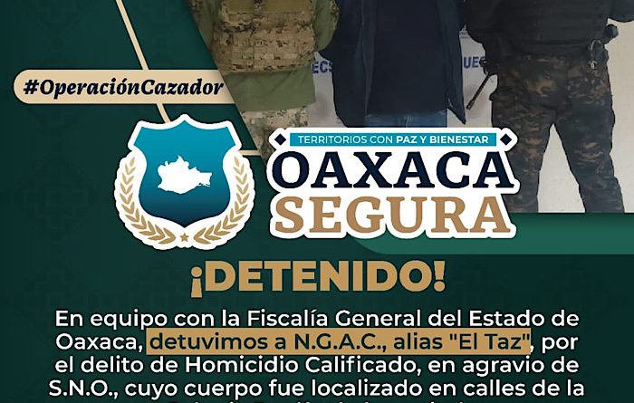 Con los elementos recabados, un Juez de Control otorgó la orden de aprehensión correspondiente, la cual fue ejecutada por elementos de la unidad de Fuerzas Especiales de la Policía Estatal, en colaboración con la Fiscalía General del Estado de Oaxaca (FGEO) y la Secretaría de Marina (Semar).