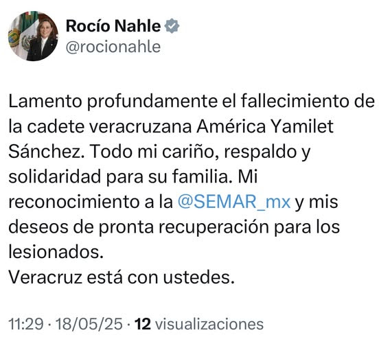 «Lamento profundamente el fallecimiento de la cadete veracruzana América Yamilet Sánchez. Todo mi cariño, respaldo y solidaridad para su familia. Mi reconocimiento a la @SEMAR_mx y mis deseos de pronta recuperación para los lesionados. Veracruz está con ustedes», expresó.