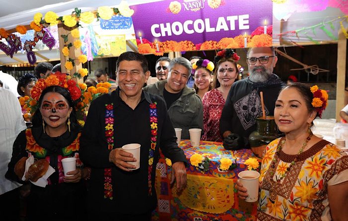 Oaxaca de Juárez, Oax. 30 de octubre de 2025.- Entre flores de cempasúchil, el inconfundible olor a copal y música tradicional; el Gobernador Salomón Jara Cruz junto a la Presidenta Honoraria del Sistema DIF Oaxaca, Irma Bolaños Quijano; compartieron con cientos de personas chocolate, café, pan y tamales en la Verbena Popular Xandú.