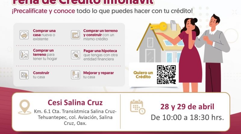 El INFONAVIT realizará Feria de Atención en el municipio de Salina Cruz, con el objetivo de acercar sus diferentes productos de financiamiento a las y los derechohabientes.