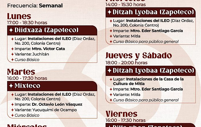 La programación semanal contempla diversas lenguas y variantes: Diidxazá (zapoteco, variante Juchitán de Zaragoza), que será impartido los lunes de 17:00 a 18:30 horas, por el director general del Instituto, Víctor Cata.
