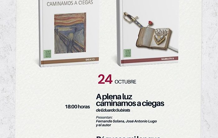 Esta jornada literaria programada a partir de las 18:00 horas, iniciará con la presentación del libro de ensayos “A plena luz caminamos a ciegas”, de Subirats. Posteriormente, a las 19:00 horas, tendrá lugar la novela histórica “Péguese mi lengua”, de Solana Olivares.
