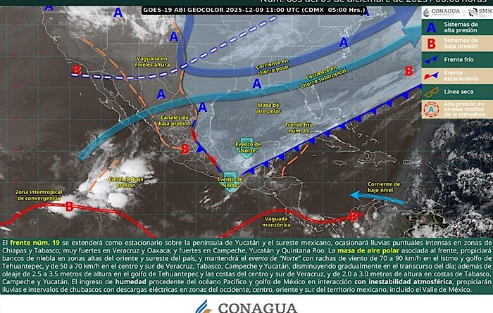 Estas condiciones se derivan del frente frío número 19, que se mantendrá casi estacionario sobre el sureste del país y la Península de Yucatán.