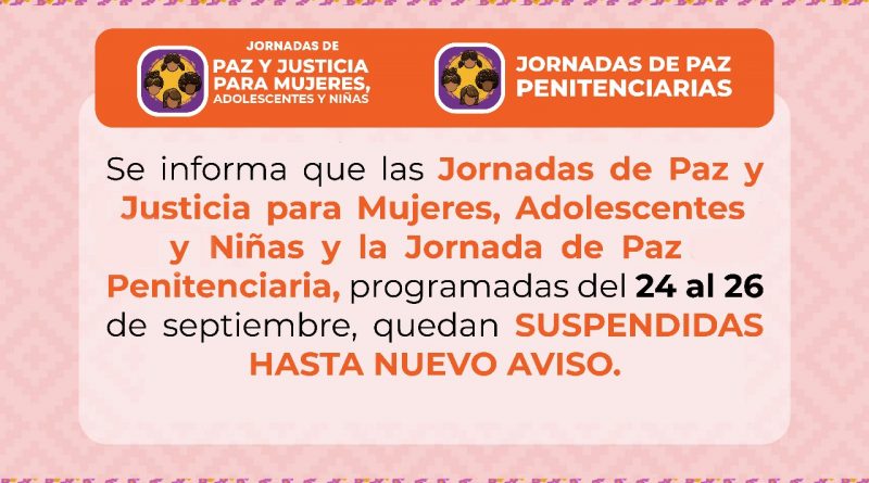 Toda vez que este 24 y 25 de septiembre se realizarían las Jornadas de Paz y Justicia para Mujeres, Adolescentes y Niñas en Santiago Jocotepec y San Lucas Ojitlán, respectivamente, así como el 26 la Jornada de Paz en el Centro Penitenciario de San Juan Bautista Tuxtepec, se prevé su reprogramación una vez que dicho fenómeno meteorológico no represente riesgo alguno para la población.