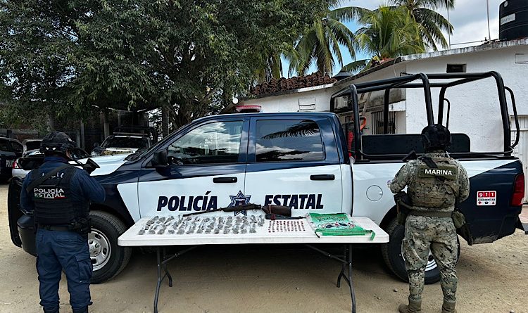 Oaxaca de Juárez, Oax., 6 de enero de 2026.- La Secretaría de Seguridad y Protección Ciudadana (SSPC), a través de la Policía Estatal y en coordinación con la Secretaría de Marina (Semar), aseguró 160 bolsas con presunto cristal y marihuana, así como un arma larga de fuego y dos cartuchos en Santiago Jamiltepec.