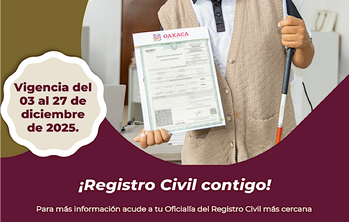Oaxaca de Juárez, Oax. 3 de diciembre de 2025.- El Gobierno del Estado a través de la Dirección del Registro Civil, brinda del 3 al 27 de diciembre, impresiones gratuitas de actas de nacimiento y de sistema Braille a las personas con discapacidad de la entidad.