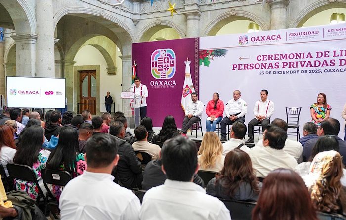 Oaxaca de Juárez, Oax. 23 de diciembre de 2025.- En un acto de justicia social, resultado de un trabajo responsable, profesional y comprometido con las leyes y la dignidad humana; el Gobernador Salomón Jara Cruz entregó de manera simbólica, 6 de 121 constancias de liberación a personas indígenas y de escasos recursos, privadas de su libertad, condenadas por actos menores.