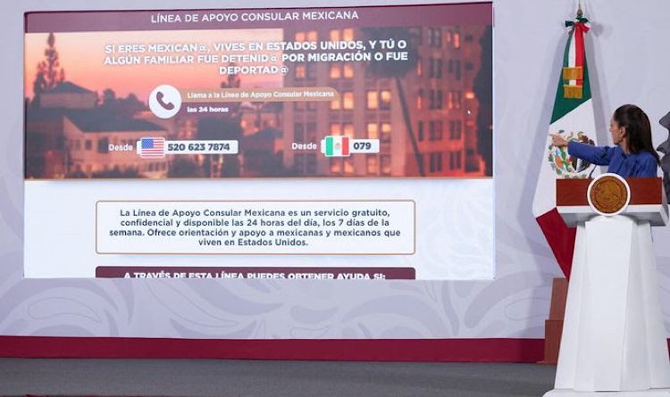 | La Jefa del Ejecutivo Federal recordó SRE habilitó las páginas Mi Consulado www.miconsulado.sre.gob.mxdonde se puede acceder a los servicios consulares y en la Línea de Apoyo Consular www.gob.mx/apoyoconsular en el que a través del número telefónico 520 623 7874 desde Estados Unidos y 079 en México, se otorga, las 24 horas del día, los 7 días de la semana, servicio gratuito, confidencial, a los connacionales que viven del otro lado de la frontera. |