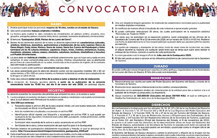 De acuerdo con la convocatoria oficial, podrán participar personas mayores de 18 años, nacidas en Oaxaca, presentando obras originales e inéditas bajo la temática “Guelaguetza 2026. Fiesta de los Lunes del Cerro”.