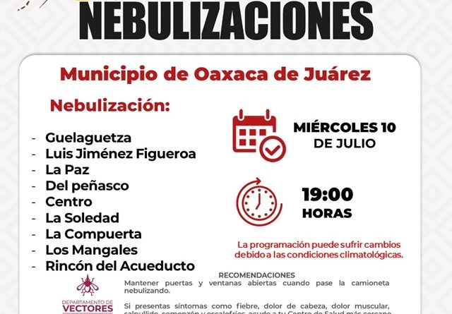 La programación de las nebulizaciones está sujeta a las condiciones climáticas, por lo que en caso de lluvia y fuertes vientos, la estrategia se reprogramará en las madrugadas, detalló durante el corte informativo de dengue que se transmite por la Corporación Oaxaqueña de Radio y Televisión (CORTV), la jefa del departamento de urgencias epidemiológicas y desastres, Adriana Jarquín González.