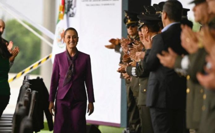 | “Permítanme detenerme un momento para rendir un homenaje especial, como primera mujer Presidenta, a las mujeres que forman parte del Ejército, de la Fuerza Aérea y de la Guardia Nacional. Mujeres valientes que han demostrado que la inteligencia, la disciplina y la fortaleza no tiene género; que han abierto camino en espacios que durante mucho tiempo les fueron negados y lo han hecho con dignidad, con entrega y con resultados que hoy enorgullecen a todo México”, expresó. |