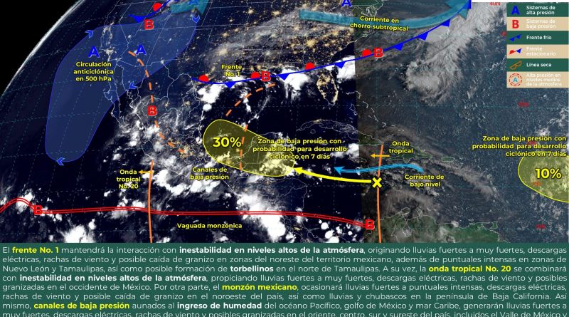 De acuerdo con el pronóstico del tiempo emitido por la Comisión Nacional del Agua (Conagua), las condiciones meteorológicas serán inestables debido a la permanencia de un canal de baja presión y la entrada de humedad del Océano Pacífico, favoreciendo el desarrollo de nublados densos y lluvias después del mediodía.